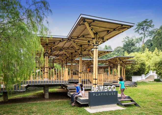 Nằm trong khu vườn hồ nước Kuala Lumpur, Bamboo Playhouse khai thác tre theo dạng cột – mái – sàn với kết cấu mở, cho phép gió và ánh sáng tự nhiên đi qua. Công trình trở thành ví dụ điển hình cho xu hướng “kiến trúc thở”, nơi vật liệu tự nhiên tạo ra không gian thư giãn và kết nối cộng đồng.