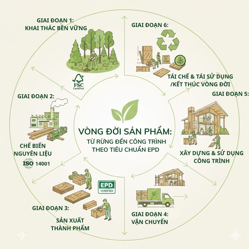 EPD (Environmental Product Declaration): Đây là bản tuyên bố sản phẩm môi trường dựa trên đánh giá vòng đời (LCA). EPD cung cấp dữ liệu minh bạch về tác động môi trường của sản phẩm từ khâu khai thác đến khi tiêu hủy. Trong hệ thống LEED v4, việc sử dụng vật liệu có EPD giúp dự án đạt điểm trong hạng mục Building Product Disclosure and Optimization. Đây là dữ liệu mà rất ít nhà cung cấp vật liệu xây dựng tại Việt Nam có thể cung cấp một cách chuẩn chỉnh như Trelife.