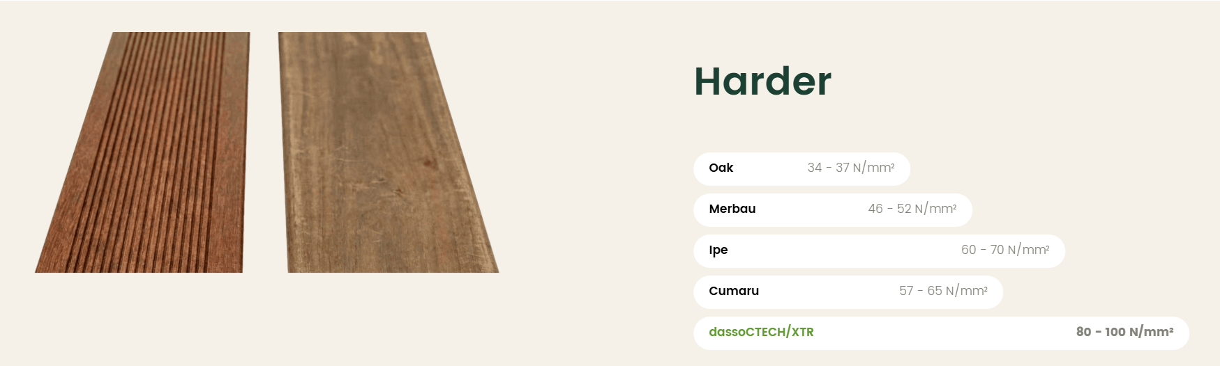 Dựa trên các thông số kiểm định thực tế, tre ép khối Dasso sở hữu độ cứng lên tới 100 N/mm². Khi đặt con số này cạnh các loại gỗ quý hiếm và gỗ cứng danh tiếng toàn cầu, chúng ta mới thấy rõ sức mạnh của công nghệ ép khối mật độ cao: