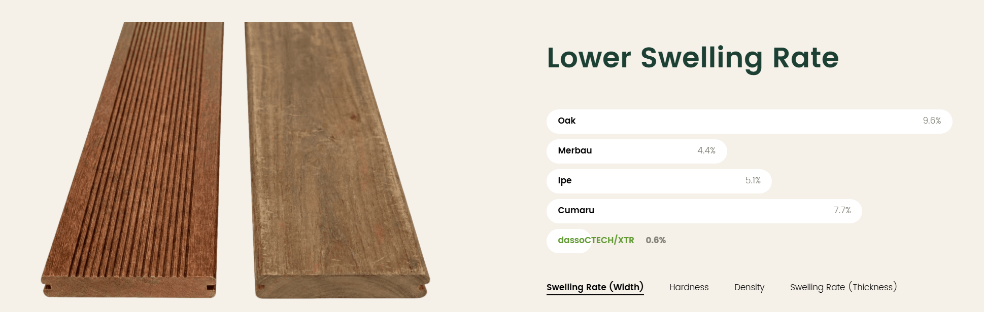 Tre Dasso được xử lý qua công nghệ biến tính nhiệt, loại bỏ hoàn toàn đường và tinh bột (những tác nhân hút ẩm và gây nấm mốc). Kết quả là tre ép khối có độ ổn định kích thước cao gấp 2.5 lần so với gỗ tự nhiên. Chỉ số giãn nở vì nhiệt và ẩm của tre rất thấp, giúp mặt sàn luôn phẳng phiu, các mối nối kín khít tuyệt đối qua hàng chục mùa mưa nắng. Đây là yếu tố mà ngay cả những loại gỗ quý lâu năm nhất cũng khó có thể đảm bảo hoàn hảo.