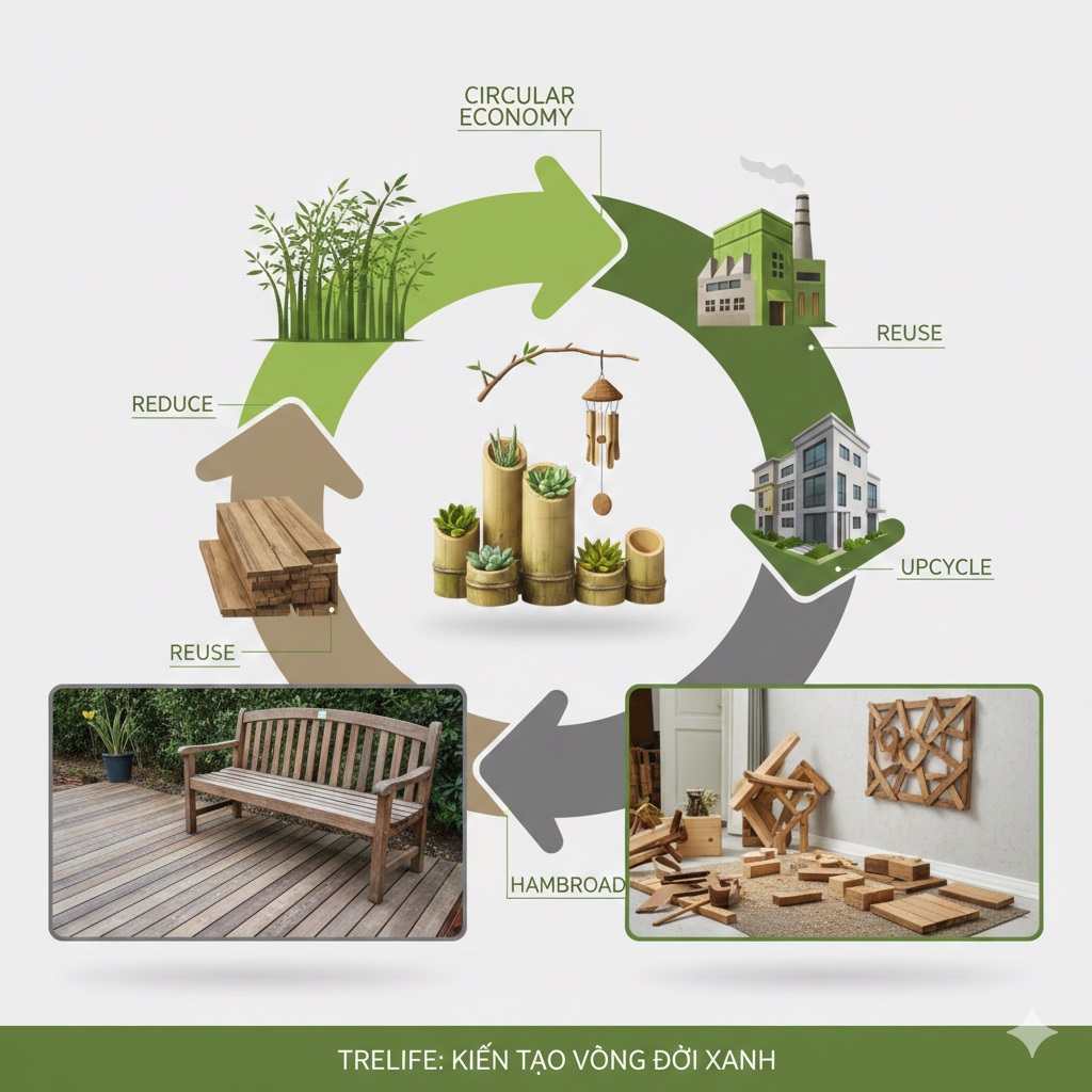 Nhờ quy trình sản xuất sạch, không ngâm tẩm hóa chất độc hại, tre và gỗ biến tính Trelife có khả năng phân hủy sinh học hoàn toàn khi kết thúc sứ mệnh. Chúng có thể được tái chế thành nguyên liệu cho các ngành tiểu thủ công nghiệp hoặc trở thành nguồn năng lượng sinh học (biomass). Đây là minh chứng rõ nhất cho mô hình "Cradle-to-Cradle" (Từ nôi đến nôi) – nơi kết thúc của một vòng đời sản phẩm chính là điểm khởi đầu cho một giá trị mới.