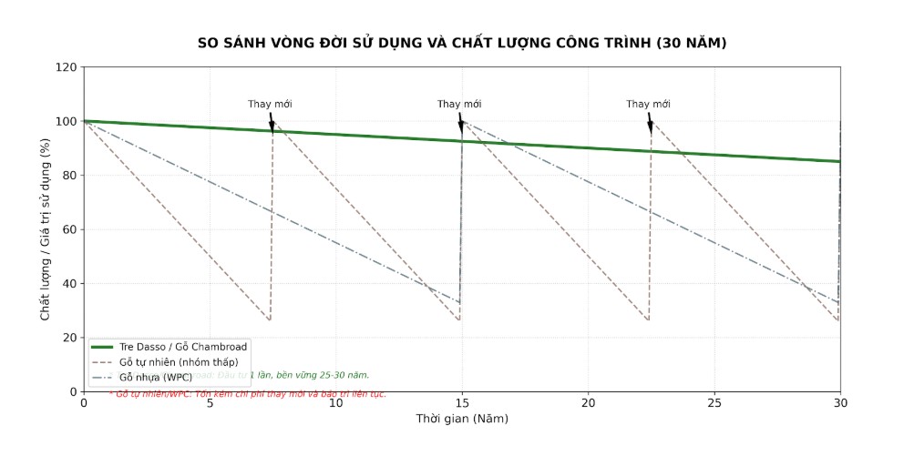 Vòng đời của sản phẩm tre và gỗ công nghệ tại Trelife được thiết kế để tối ưu hóa mọi giai đoạn. Thay vì phải thay thế định kỳ sau mỗi 3-5 năm do mục nát như các loại gỗ tự nhiên nhóm thấp, hoặc sự xuống cấp về thẩm mỹ của gỗ nhựa (WPC) dưới tác động của tia UV, gỗ tre Dasso/Greezu và gỗ Chambroad duy trì sự ổn định vượt trội. Việc kéo dài giai đoạn "sử dụng" chính là cách hiệu quả nhất để giảm thiểu tổng lượng phát thải carbon và rác thải xây dựng ra môi trường. Đây không chỉ là câu chuyện về môi trường, mà là một bài toán kinh tế thông minh cho những nhà đầu tư có tầm nhìn dài hạn.